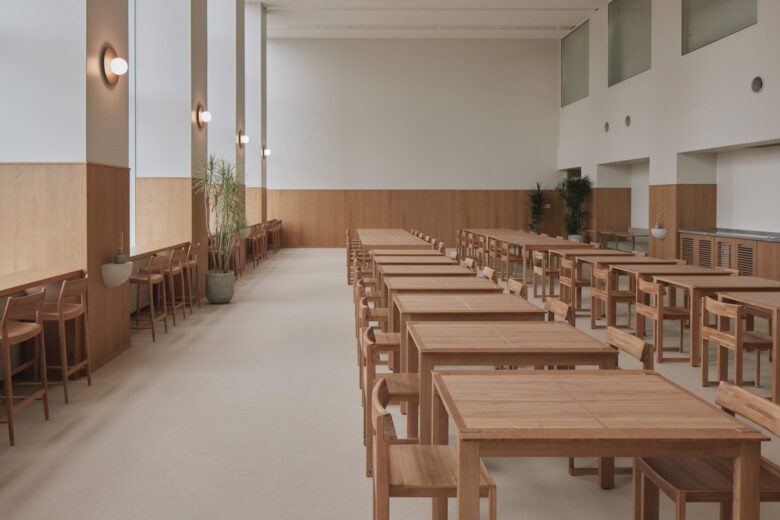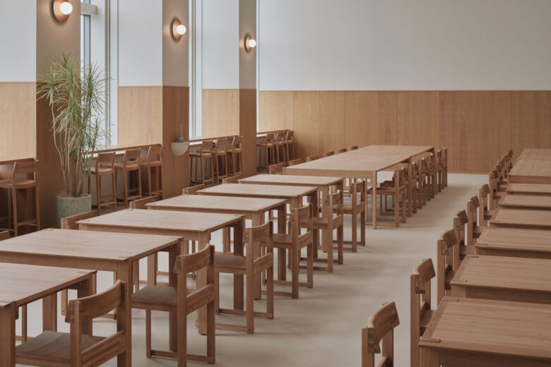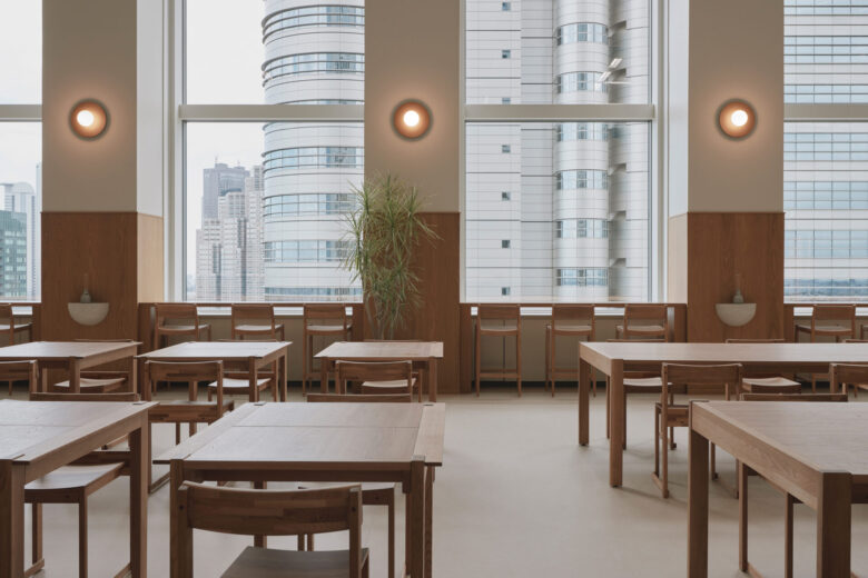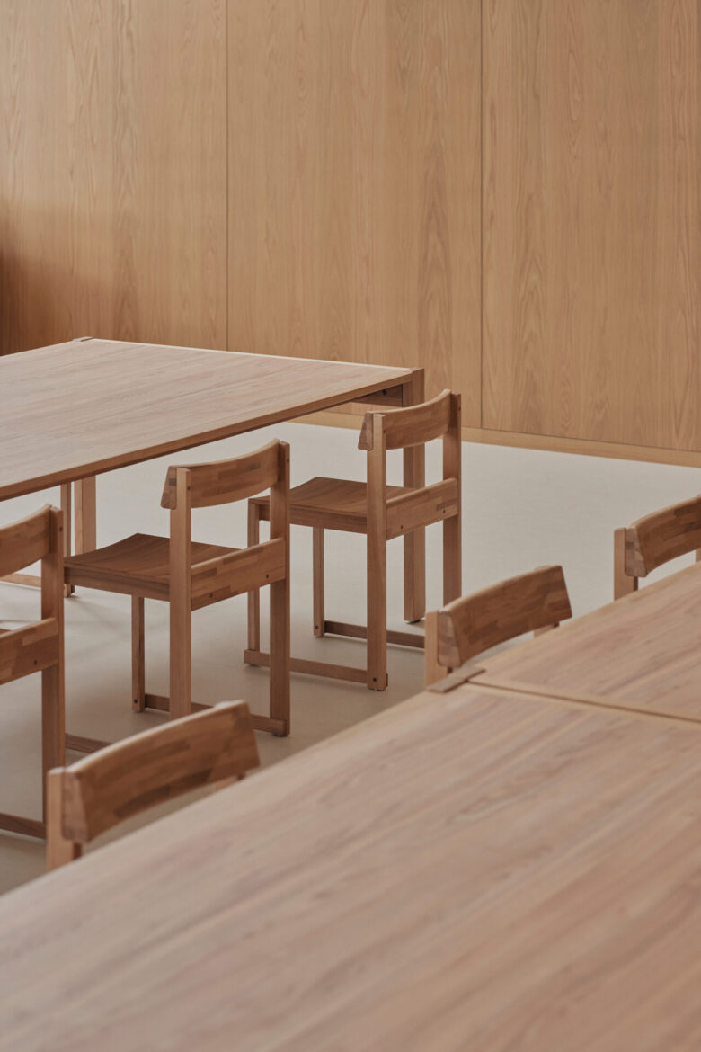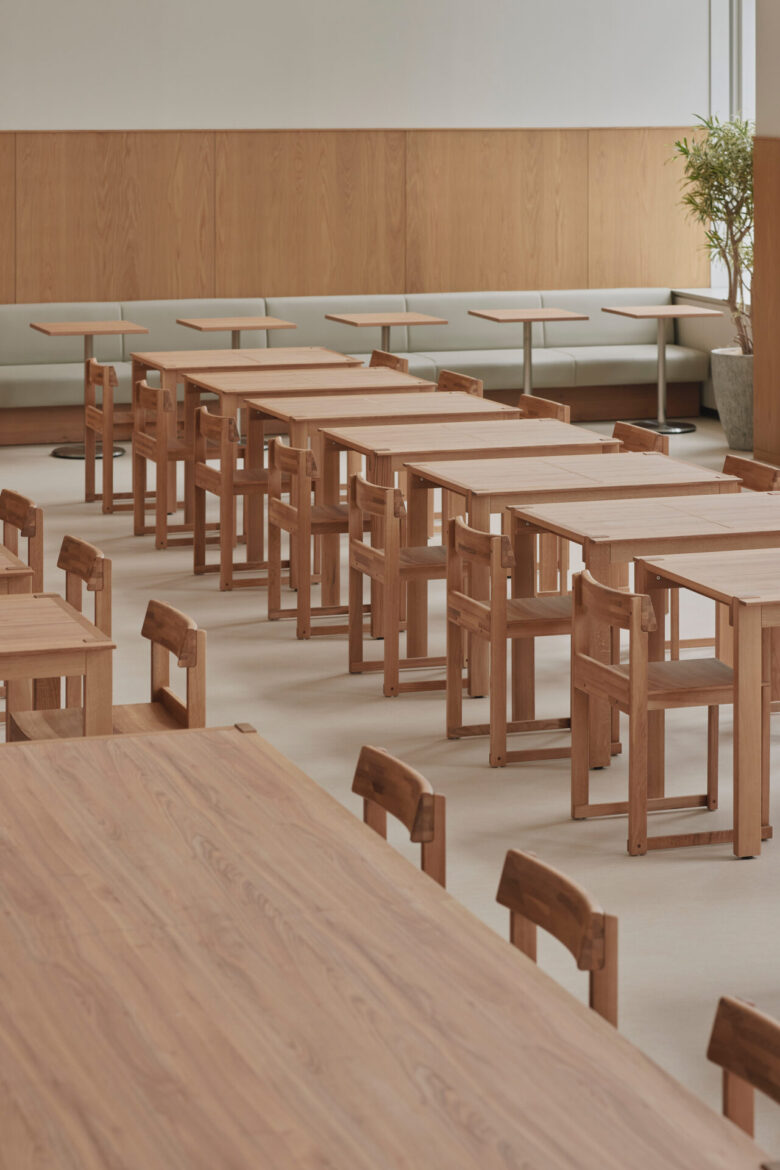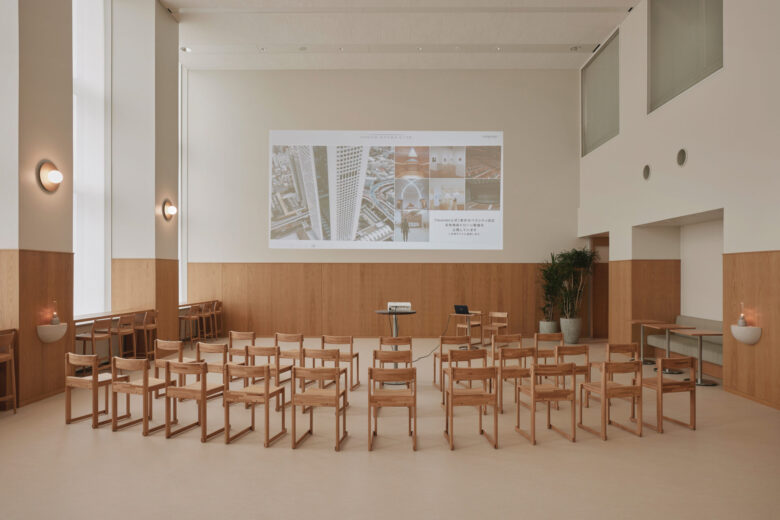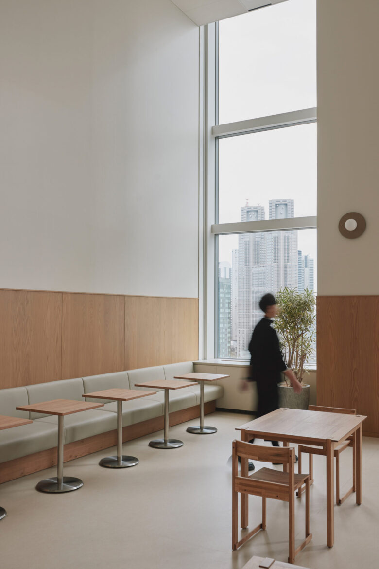 Located next to the café lounge, the open pantry offers a relatively quiet environment without a café or shop, where users can enjoy lunch or hold events. As a shared space for office occupants, our intention was for it to be a welcoming area that would be cherished for a long time. We designed it with hidden casters under the tables for easy movement and stacking chairs, ensuring layout flexibility while maintaining a tidy appearance when many chairs are arranged.